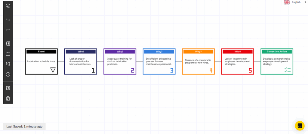 In a manufacturing plant, a repeated machine failure was traced to a lubrication schedule issue. Using the 5 Whys Turbo feature in EasyRCA, the team quickly identified the underlying procedural gap, reducing downtime and improving workflow efficiency.