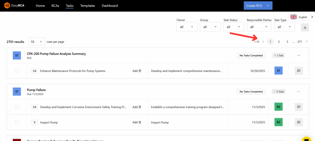 Statuses on the RCAs table now include color-coded formatting, making it easy to see the progress of each RCA at a glance and encourage timely completion.